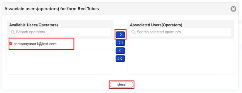 11. Assign users to the created Form by selecting the user, click on the top arrow to assign the Form and after that, click "close" to return to the portal.