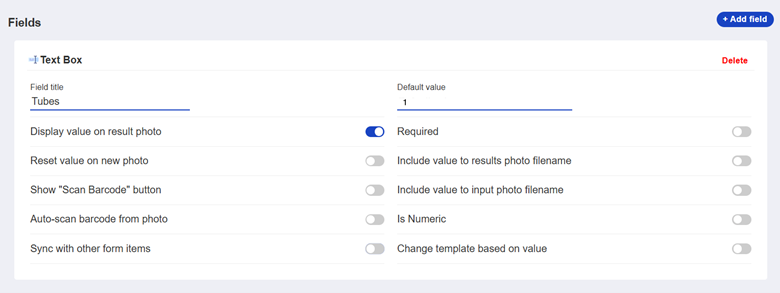7. In this example we choose the textbox field. Name the filed (e.g. Tubes) and give it a default value (e.g. 1). The textbox field has a list of settings which you can enable/disable based on your workflow needs.