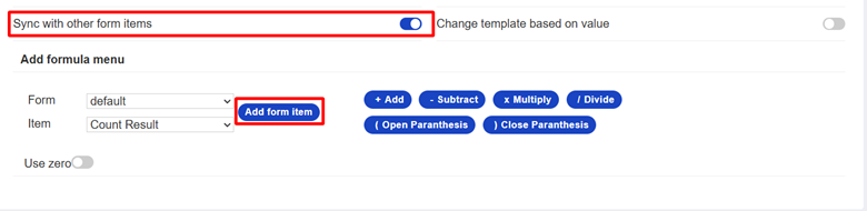8. If you want to sync the field with other form items, enable the "Sync with other form items". In the formula menu, choose the form and item you want to sync your form with. Then click on "Add form item".