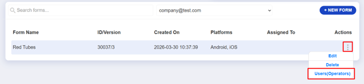 10. To assign the form to your users, click on the three dots from the selected Form and click on "Operators". You can assign/remove the Form to any user, at any time.